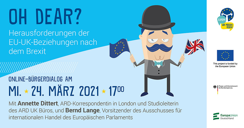 Wir laden Sie am 24. März, 17:00-18:30 Uhr, herzlich ein zu unserem Online-Bürgerdialog „Oh Dear? Herausforderungen der EU-UK-Beziehungen nach dem Brexit“. Bringen Sie Ihre Anliegen und Fragen ein und treten Sie in den virtuellen Dialog mit: