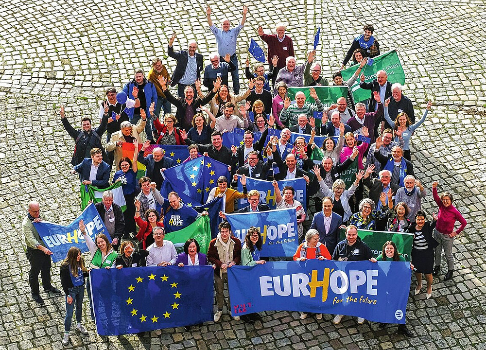 Die Delegierten legten sich kräftig ins Zeug und erhielten viele praktische Anregungen. Die gute Stimmung wurde beim traditionellen EUD/JEF-Familienfoto festgehalten. Das fröhliche Foto auf der Titelseite zeugt von dem Elan, mit dem unsere Verbände in den Endspurt zur Europawahl starten.
