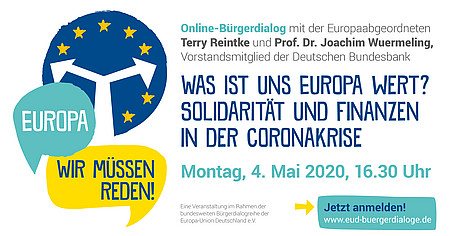 Was bedeutet uns europäische Solidarität? Sollten Deutschland und andere wirtschaftlich starke EU-Mitgliedstaaten jetzt mehr in den EU-Haushalt zahlen? Wie kann eine finanzielle Lastenteilung bei der Bewältigung der Corona-Krise und ihrer Folgen innerhalb der EU gelingen? Reichen die bereitgestellten Notfall-Kredite aus oder braucht es Corona-Bonds? Welche Instrumente helfen jetzt der Wirtschaft durch diese Ausnahmesituation?