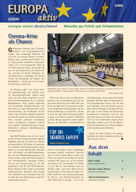 Noch vor wenigen Wochen hat sich niemand vorstellen können, wie sehr die Pandemie-Krise unser Leben verändern würde. „Wir brauchen einen Marschall-Plan für Europa“, forderten EUD-Präsident Rainer Wieland und Generalsekretär Christian Moos bereits im März. Das Präsidium formulierte seine Gedanken zu einem Wiederaufbauprogramm und verabschiedete den Beschluss in der ersten virtuellen Präsidiumssitzung Ende April. Mehr dazu in diesem Heft, und natürlich die Berichte aus den Landesverbänden mit ihren (bis März noch analogen) Dialogformaten und Veranstaltungen. Auf der letzten Seite sehen Sie übrigens, wie man trotz Kontaktsperre und Distanzgebot eine öffentliche Solidaritätskundgebung organisieren kann.