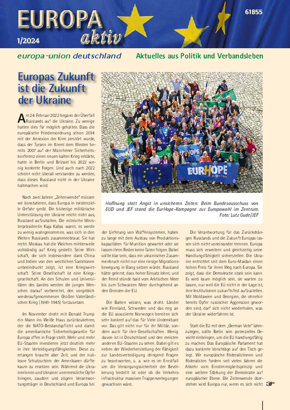 Auch bei den EUD-Bürgerdialogen liegt der Fokus auf der Europawahl. Wir berichten über den erfolgreichen Jahresauftakt in Saarbrücken und Bremen. Ernstere Töne schlägt der Leitartikel von EUD-Generalsekretär Christian Moos „Europas Zukunft ist die Zukunft der Ukraine“ an. Das EUD-Präsidium teilt diese Analyse und forderte kürzlich mehr militärische Unterstützung für die Ukraine.