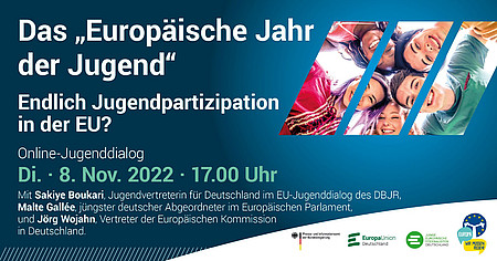 Wir laden Sie und Euch am Dienstag, den 8. November 2022, von 17:00 bis 18:30 Uhr herzlich zu unserem Online-Jugenddialog „Das „Europäische Jahr der Jugend“ – Endlich Jugendpartizipation in der EU?“ ein. Bringen Sie Ihre Anliegen und Fragen ein und treten Sie in den virtuellen Dialog mit: